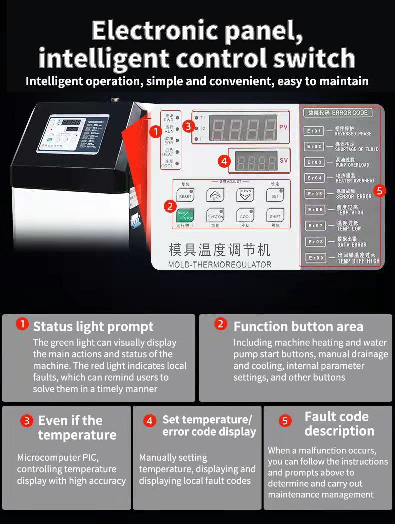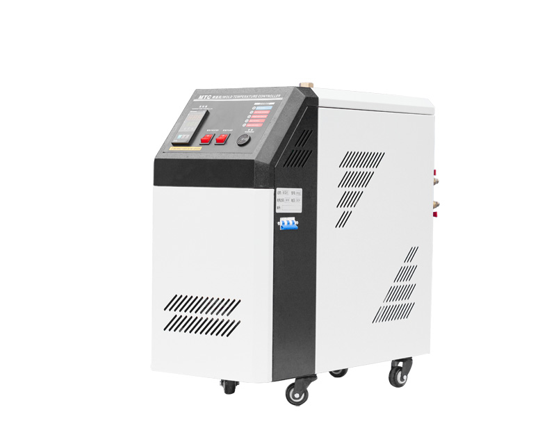 The principle of heating up the mold temperature machine: When heating up, the temperature control meter automatically analyzes the data from the temperature sensor and controls the status of the heater to achieve the set temperature. The principle of cooling down the mold temperature machine: When cooling down, the heater stops heating, the temperature control meter controls the status of the cooling solenoid valve, and the cooling water enters the heat exchanger to cool down the heat transfer oil