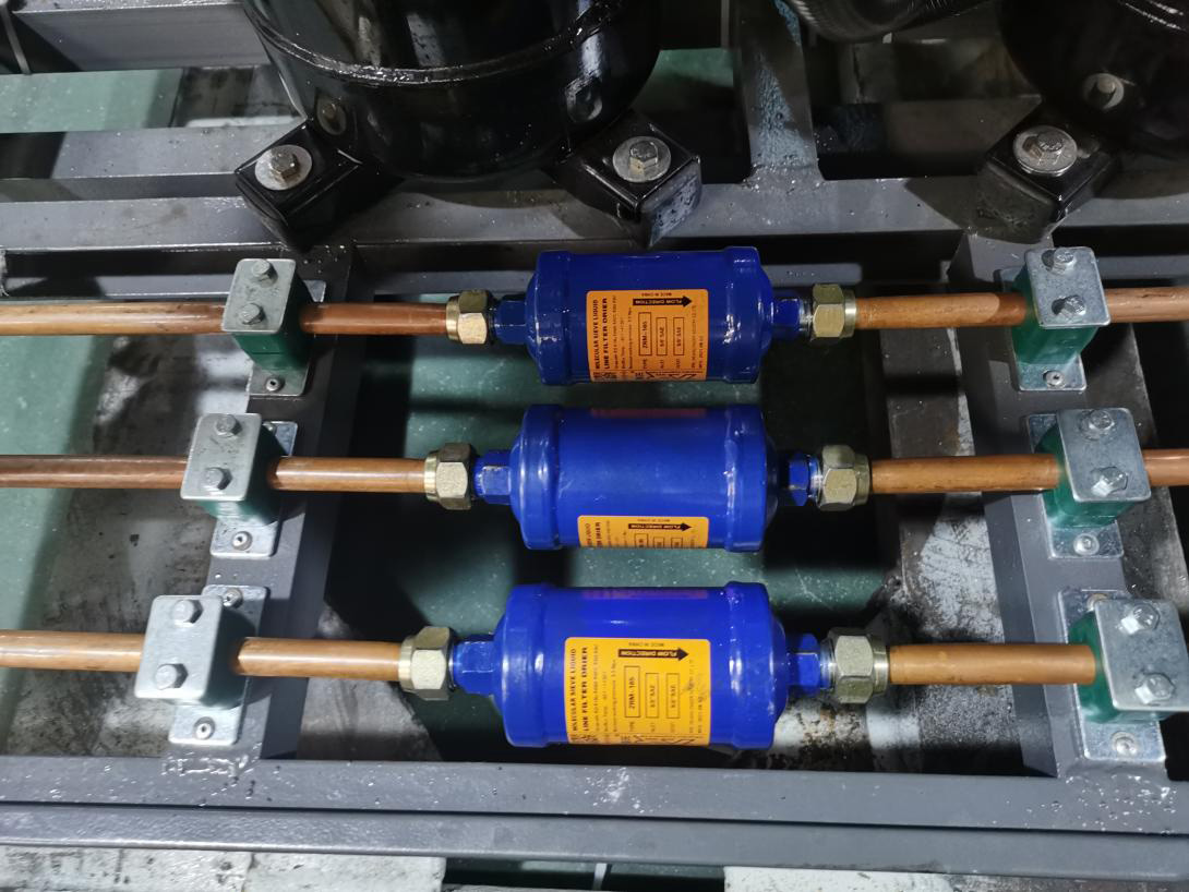 The refrigeration system of a chiller unit consists of four basic parts: compressor, condenser, throttle, and evaporator. Connect the four major components in a certain order using copper pipes to form a closed system, which is filled with a certain amount of refrigerant.
