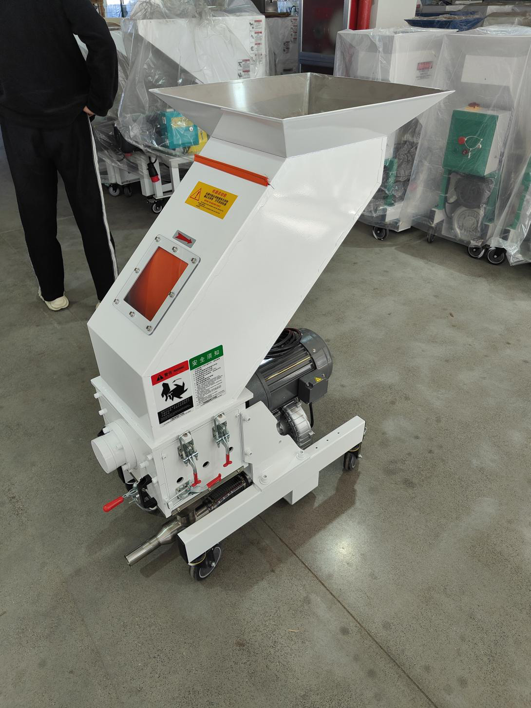 3.This unit is driven by low speed motor(150 rpm). It can granulate detective parts into well-proportioned granules.