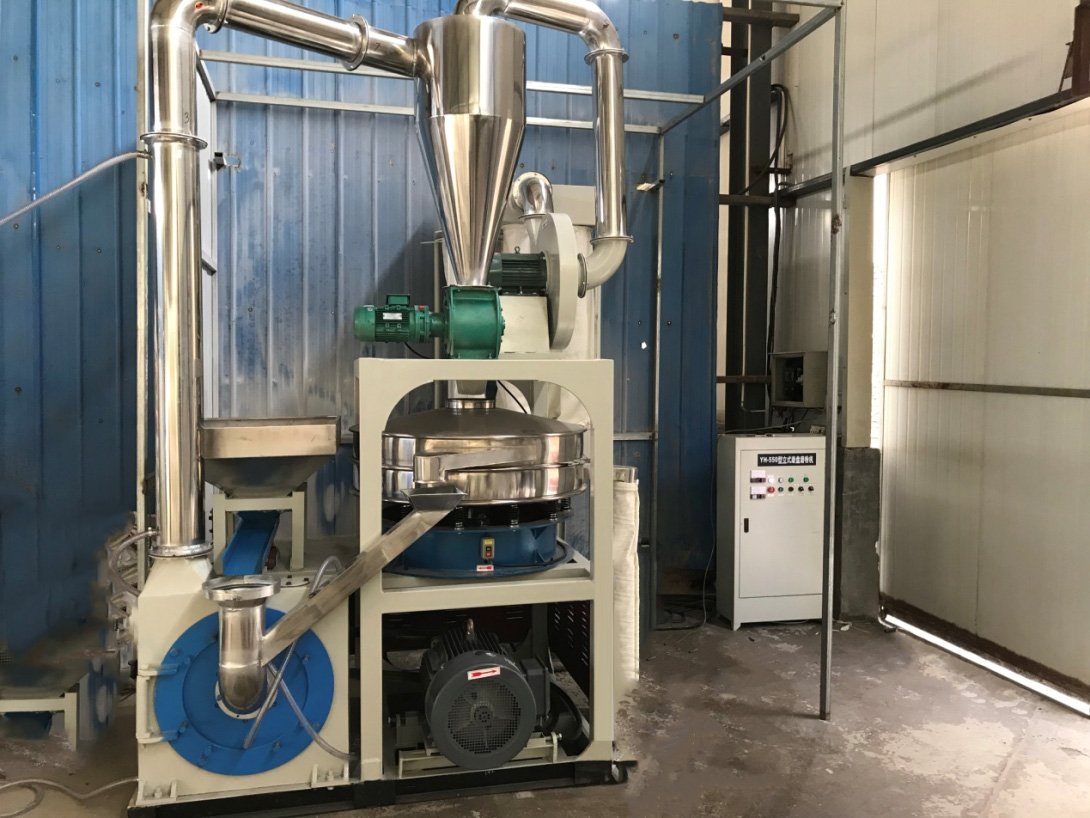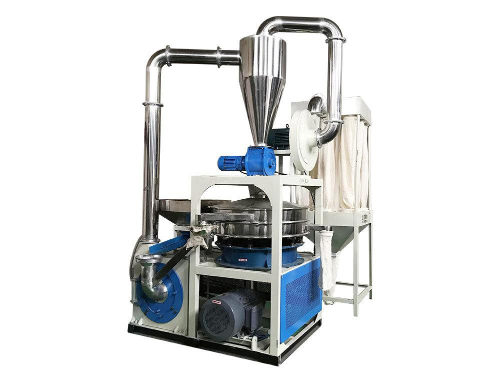 6. Scientific operation: This machine generates high-speed rotating airflow (local vortex) through the high-speed rotation of the spindle disc, causing the incoming material to rotate at high speed and shear with the blade, resulting in powder.